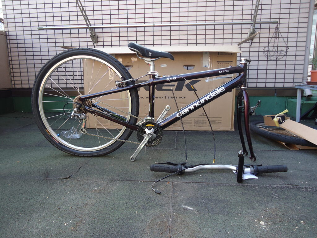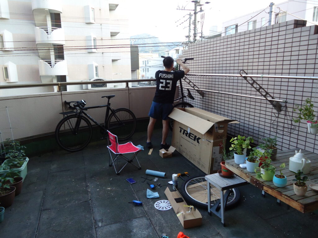 洗濯竿をつかってフレームを引っ掛けて、ハンドルを差し込む。シフターでワイヤーを緩めたりしてなんとか入った。友達に聞いて、YouTubeを使えばなんとかなる。