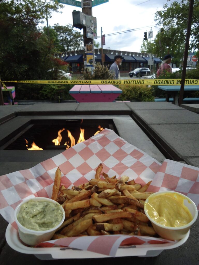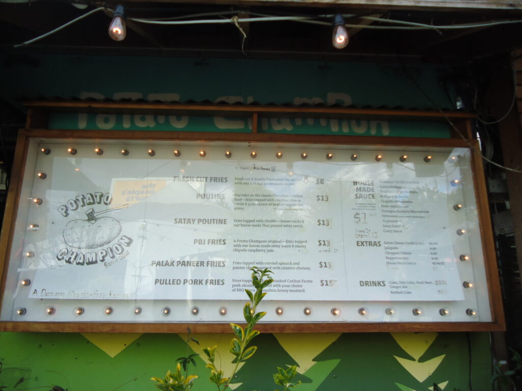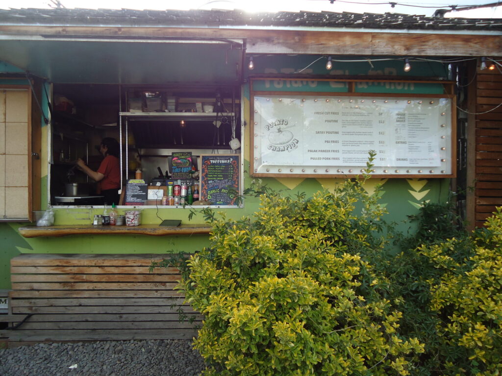 左のソースが、アボガト系のさっぱりソース、右がカレー。ポテトはマクドナルドのポテトLサイズを2つ分くったくらいガツンときた。