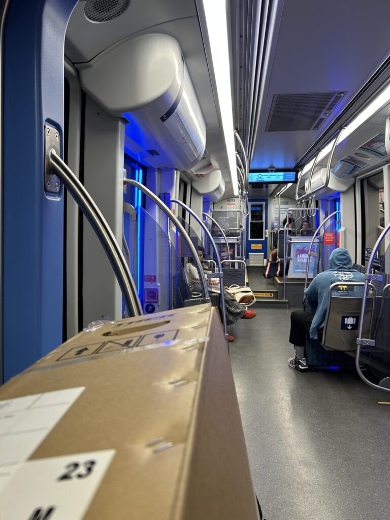 駅に降りてから、空港まで距離があることを知らず、歩こうとした。すると、輸送担当のおじさんが近づいてきて、乗せなさいと手伝ってくれた。「いいかい。箱が落ちないように抑えながら乗るんだよ!」って。