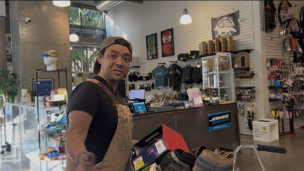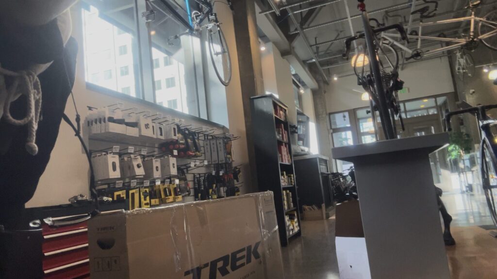 迎えてくれたのは、店員のレックスさん。その奥にはオーナーのジェシーさんもいた。私はこれまでの経緯を話した。忙しそうなのに、レックスさんは一つひとつうなずき、じっくり聞いてくれる。そして「バイクボックスはありますか?」と尋ねると、すぐに奥まで探しに行ってくれた。